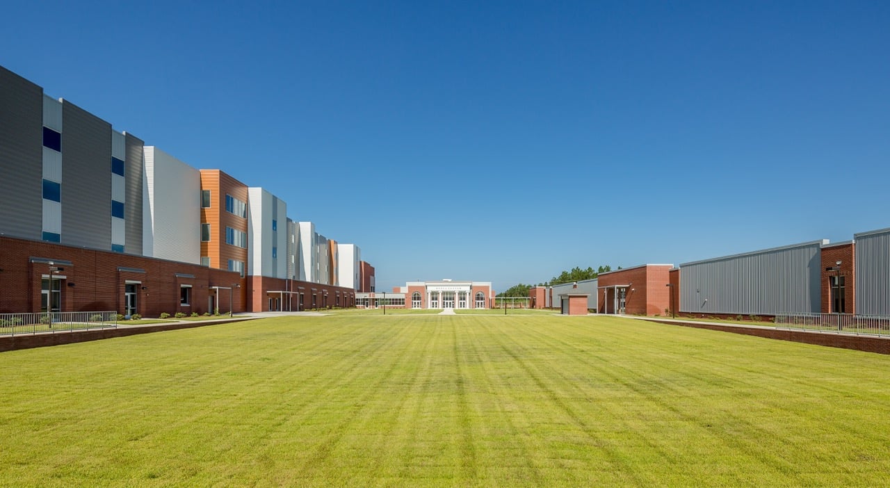 A new facility with six interconnected buildings surrounding a courtyard. It includes a main four-story building with administration, classrooms, and labs. Separate buildings house the media center, vocational labs, and cafeteria. The gymnasium has three courts and seating for 2,500.