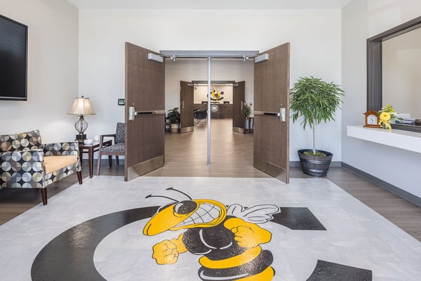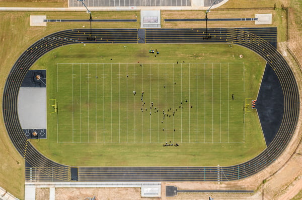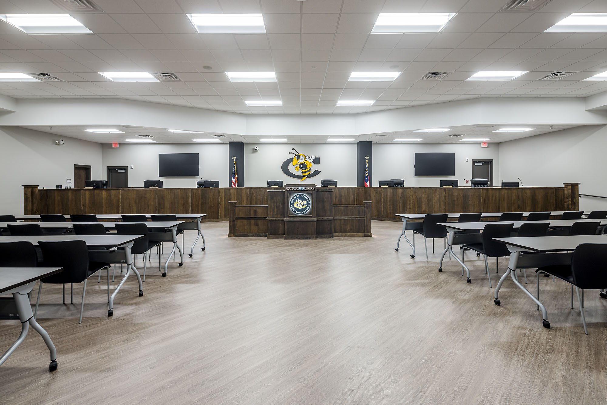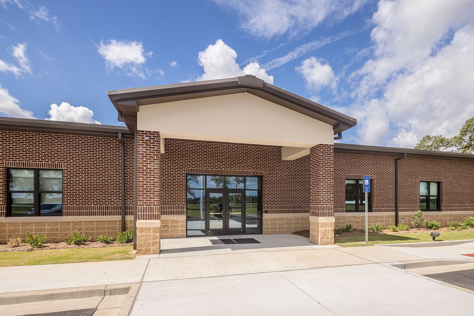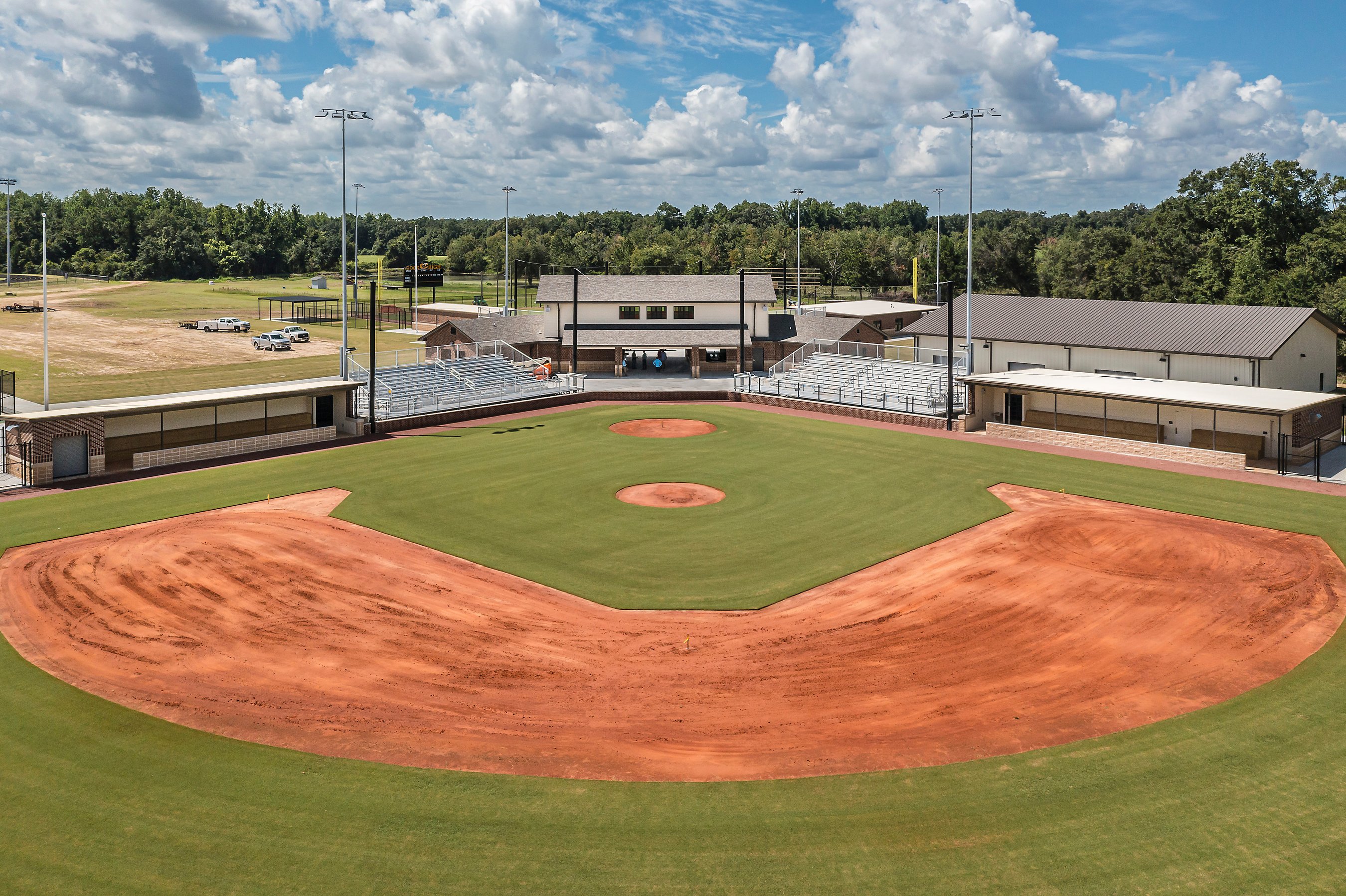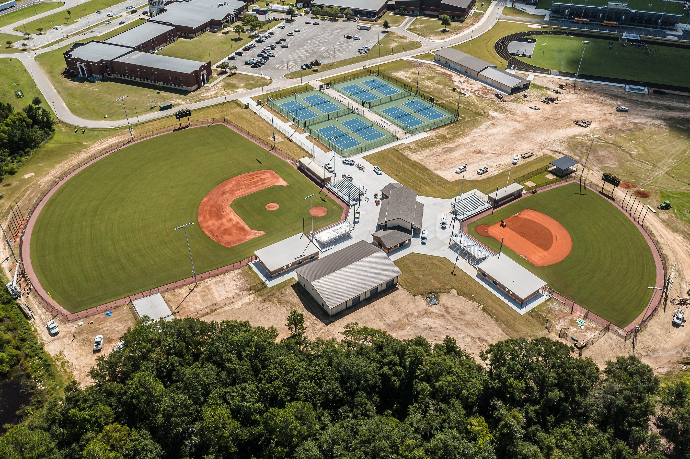The project included a new office space, conference rooms, and public meeting space for the Board of Education. The athletic complex features a practice field, track, baseball and softball fields, indoor batting cages, and a two-story building with a press box and concessions.