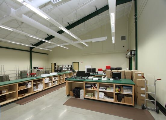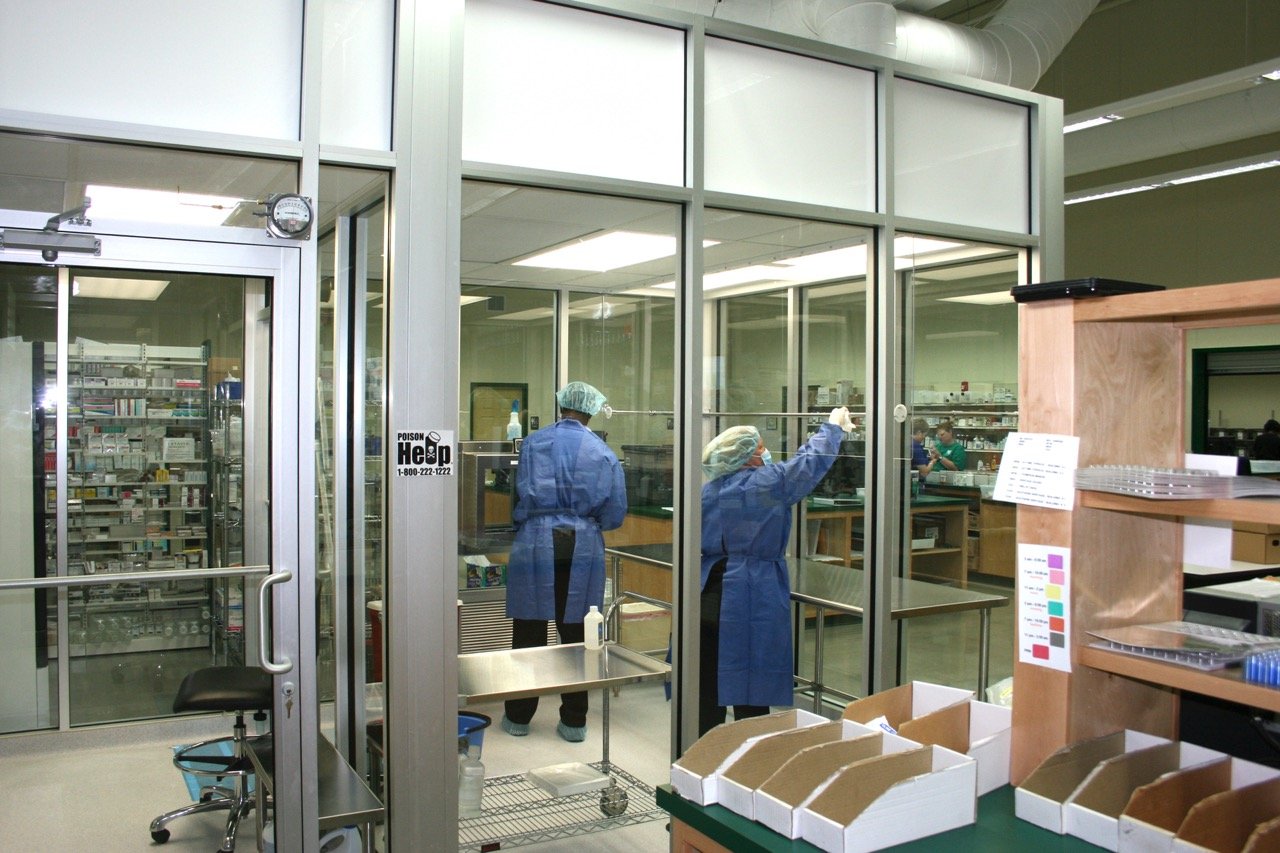 This long-term care pharmacy facility includes IV rooms, stations for 22 pharmacists, an employee daycare, offices, and a conference room. It has a steel frame, concrete foundation, and a standing seam metal roof. The warehouse is climate-controlled and includes a loading area.
