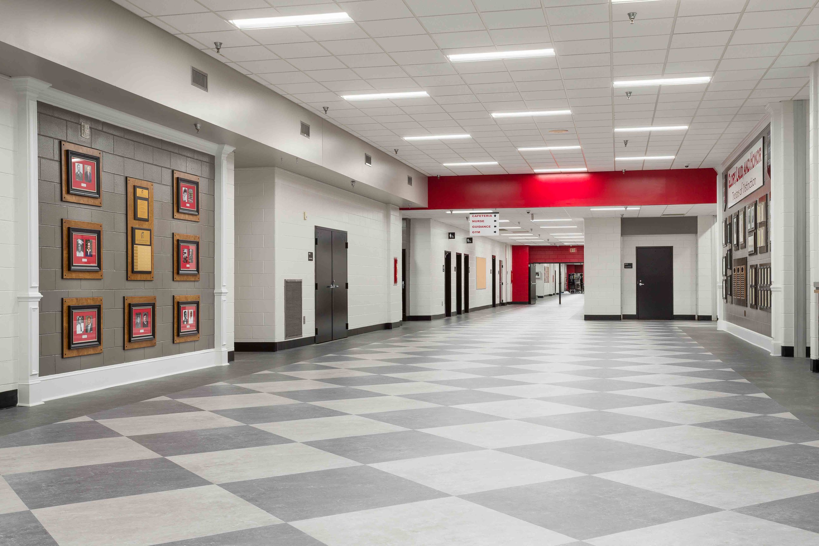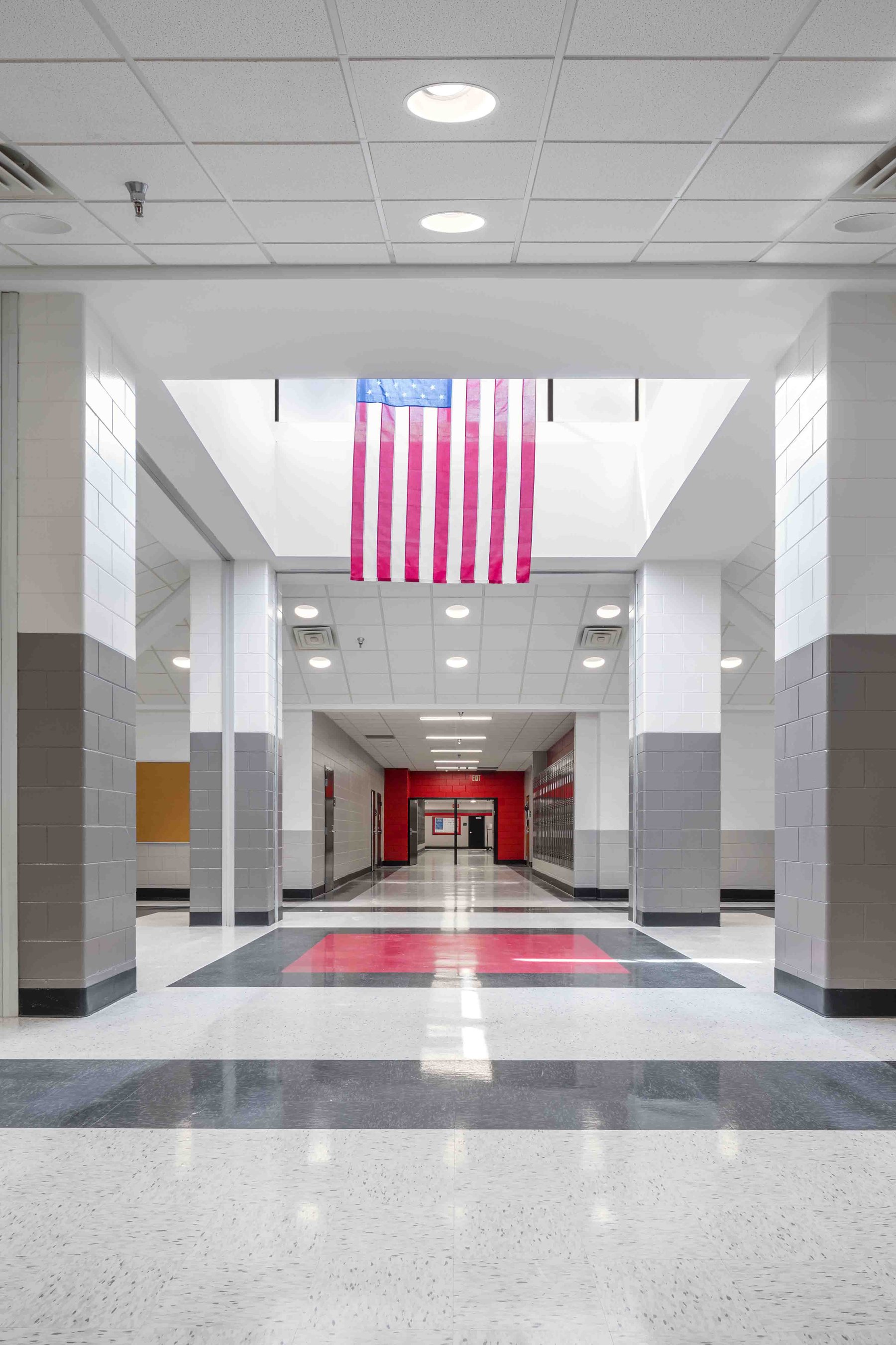 Renovations and modifications were completed on an occupied campus while classes were in session. Selective demolition was done to reconfigure spaces and add new classrooms and administrative areas. The entire facility received new flooring, ceilings, paint, lighting, and HVAC.
