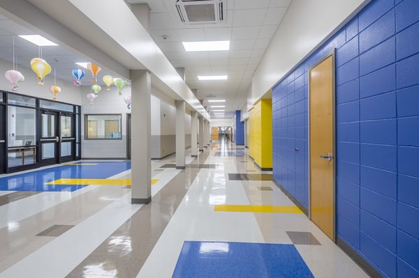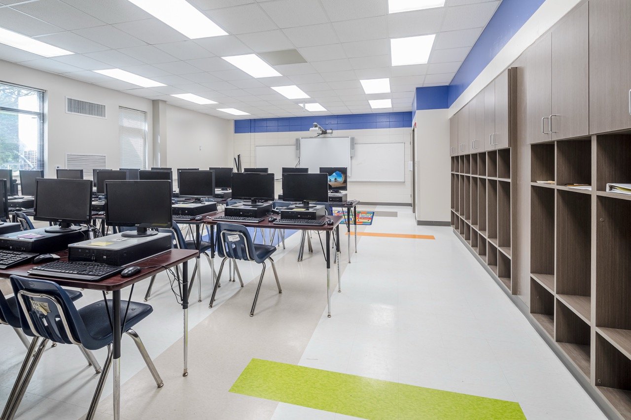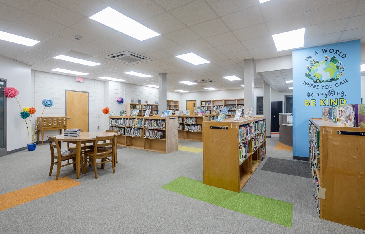 The project included a complete modernization of buildings dating from the 1950s to 1990s. The existing walls were demolished, and a new brick facade and roof were installed. A new front entrance and administration area were constructed, along with a new media center addition. Updates were made to electrical, lighting, and HVAC systems, and new flooring, ceilings, and decorative fencing were added.